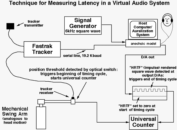 This article reports on measurements of TSL for the virtual audio system used in previous studies of localization with and without head motion. The system consisted of a Convolvotron spatialization device which simulates direct-path spatial cues using 256-pt., minimum-phase head-related transfer functions (HRTFs). It received head-position data from a Polhemus Fastrak (40 Hertz update rate). In order to measure latency, a special HRTF map was constructed which contained a single impulse at one map location and zeroes at all other locations. Latency measurements were conducted using the testbed shown in Figure 1. The Fastrak receiver was mounted on the end of a mechanical swing arm with an optical switch which detected when the arm passed through a pre-set threshold position. This event threshold was considered analogous to the initiation of head (and/or source) motion in a VAE and began the universal counter's TSL timing cycle. At the same time, the tracker sent data to the Convolvotron in polled mode via a serial line, and a signal generator fed a 6000 Hertz square wave to one of the input channels. Before the threshold was crossed, the Convolvotron was set to a zeroed map location so that no signal passed through the output channel. The experimenter then pushed the swing arm through the threshold position. The next tracker data sample received after threshold-crossing caused the Convolvotron to switch to the non-zero map location. The square wave then passed through the system and terminated the timing cycle of the universal counter whose reading was considered to be the TSL. A total of 117 such measurements were taken: mean = 54.3, standard deviation = 8.8, range = 35.4 5 to 74.6 milliseconds.