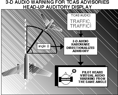 We have used virtual acoustic (3-D audio) techniques to form a head-up auditory display (Figure 1.2) for TCAS traffic advisories by processing the aural alert so that its perceived direction comes from the relative direction of intruding traffic. Immediate spatial situational awareness is conveyed, allowing faster acquisition of traffic "targets" while keeping the crew member's gaze out-the-window. Also, by accessing an alternative perceptual modality-sound-the visual perceptual modality is freed to concentrate on other head-down tasks when necessary.