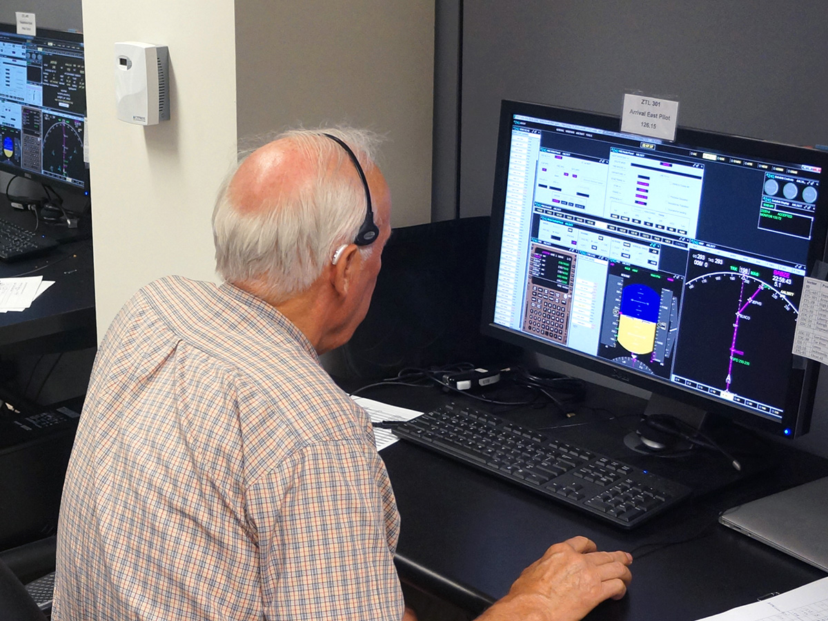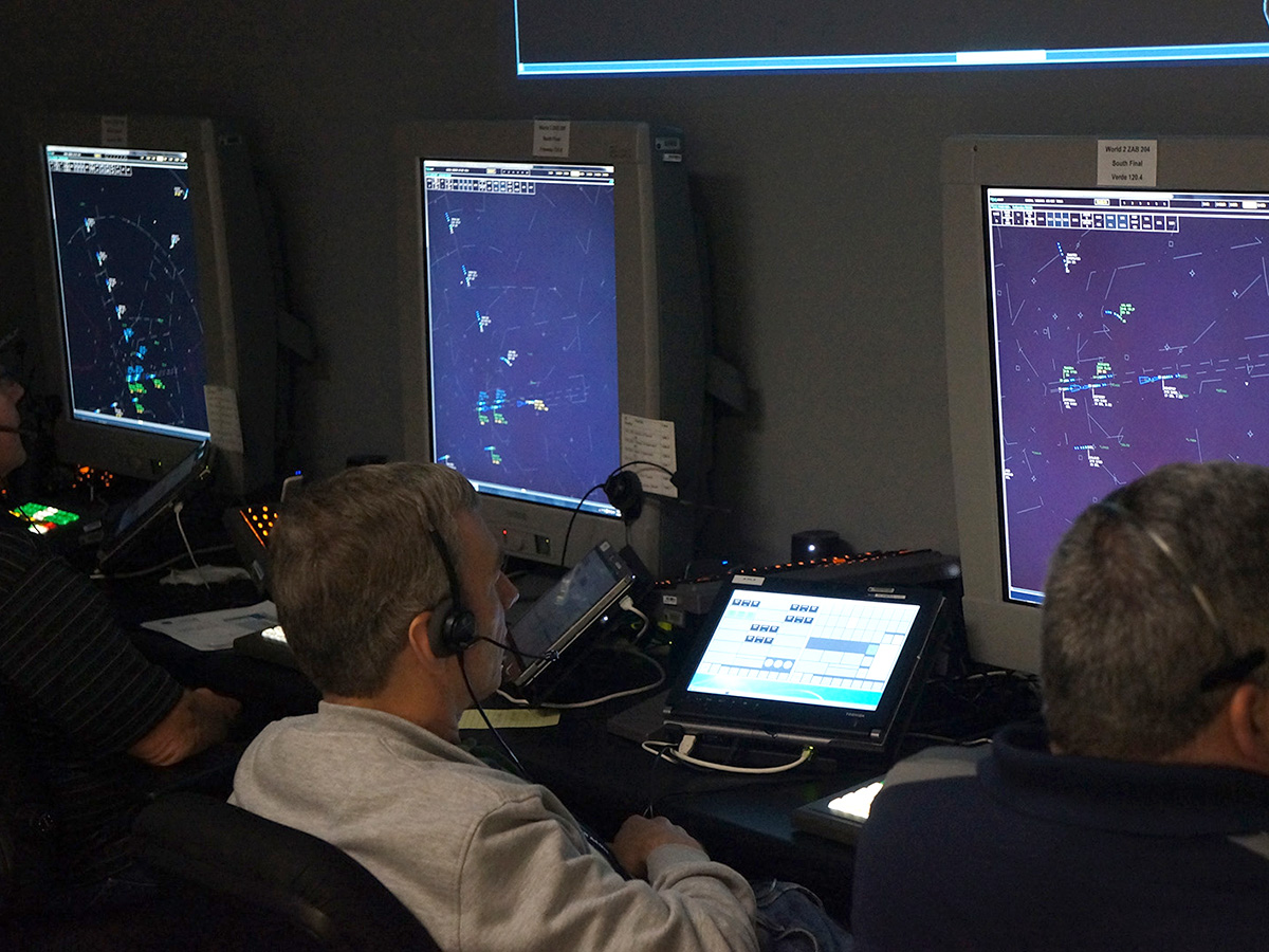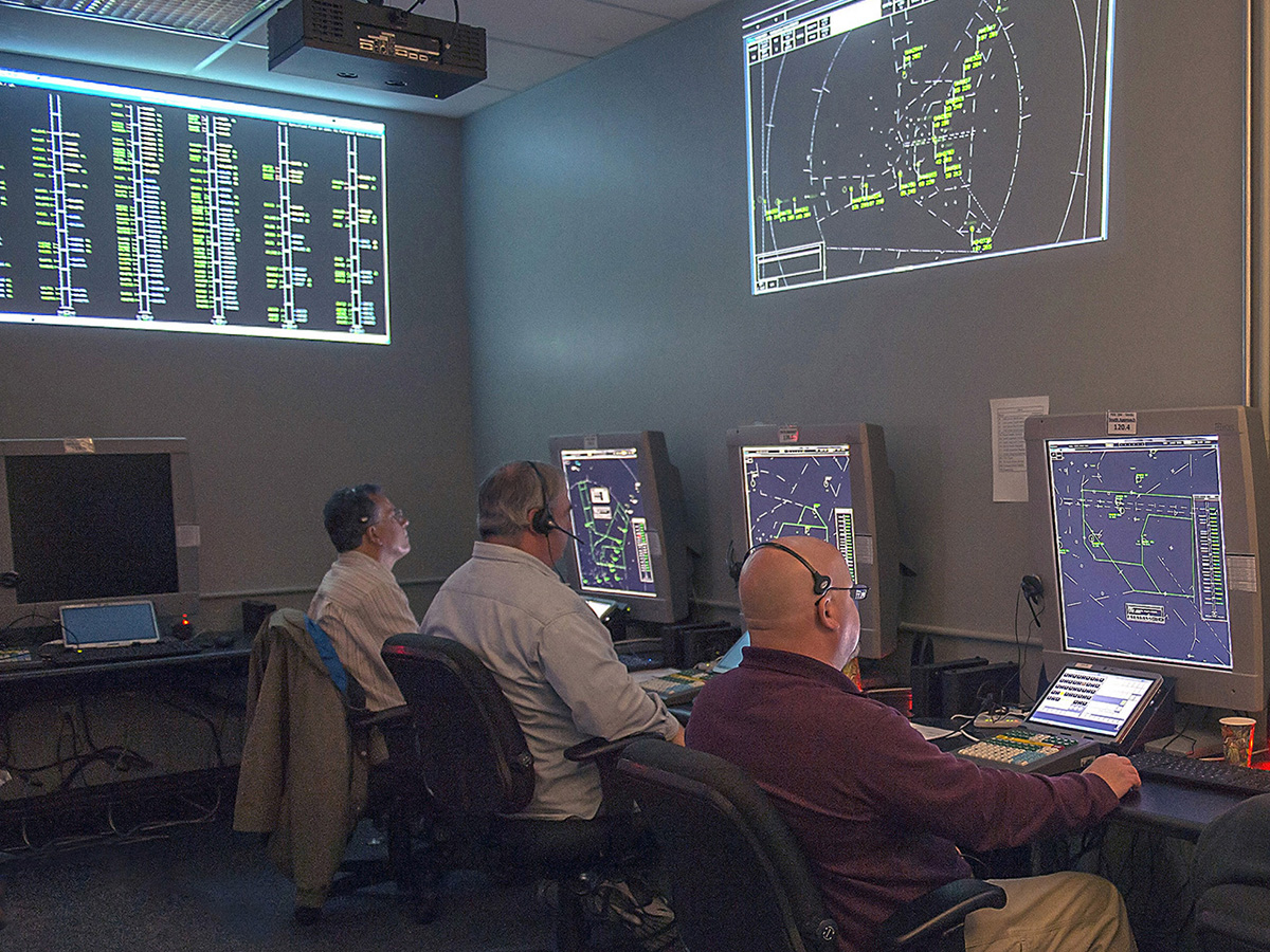 Image of the Airspace Operations Laboratory during a research simulation AOL researcher during an Air Traffic Control study AOL researchers during an Air Traffic Control study AOL researcher during an Air Traffic Control study