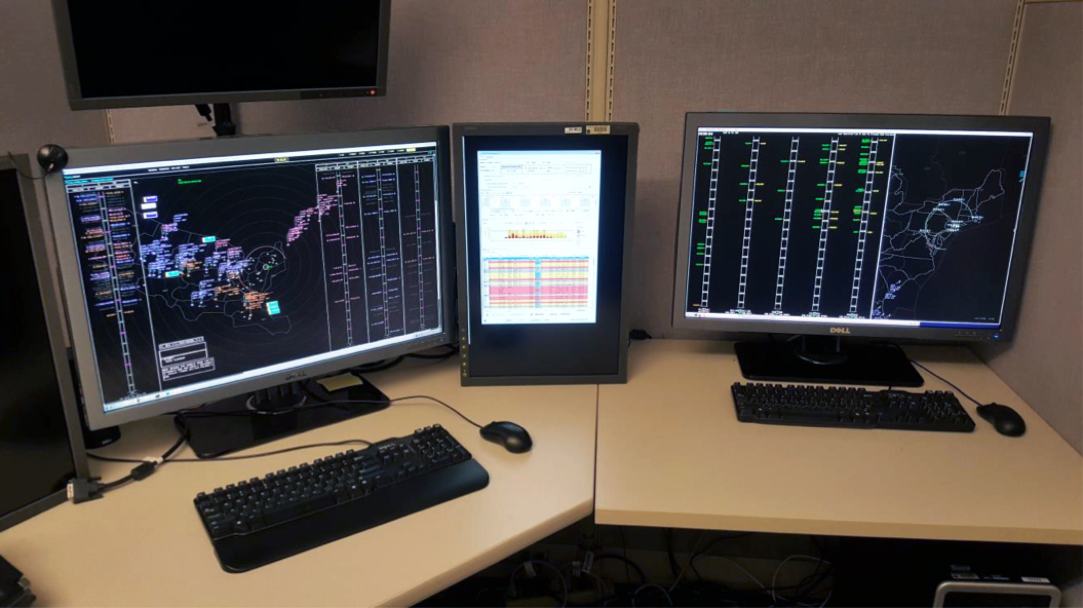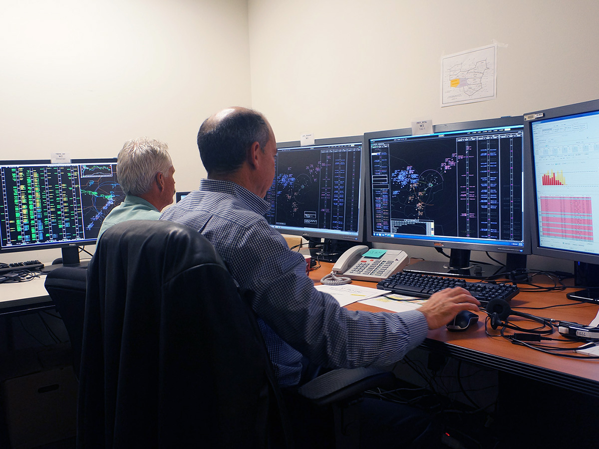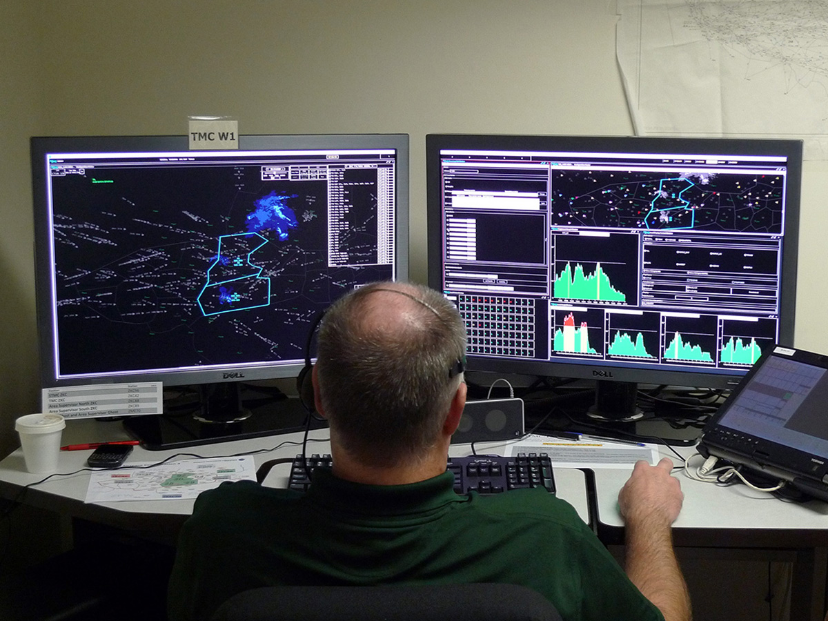 Image of the Airspace Operations Laboratory during a research simulation AOL researcher during an Air Traffic Control study AOL researchers during an Air Traffic Control study AOL researcher during an Air Traffic Control study