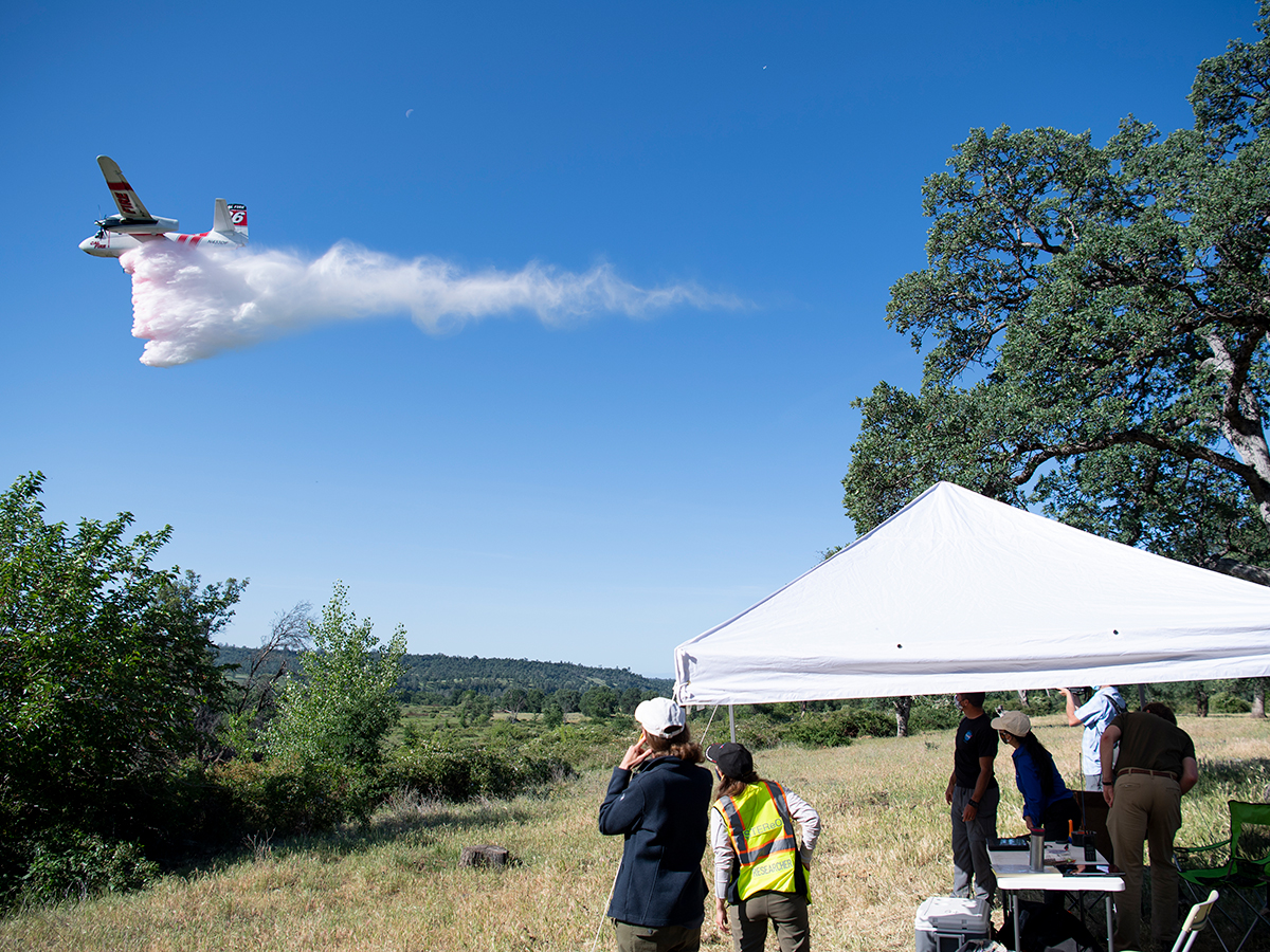 Click to see an image of a Firefighting tanker performing a water drop during a USFS/CalFire field demonstration Click to see an image of the STEReO team flight crew launching drones during a USFS/CalFire field demonstration Click to see an image of the STEReO team observing operations at the McCash wildfire in California Click to see an image of the STEReO team getting briefed on firefighting operations at the McCash wildfire in California