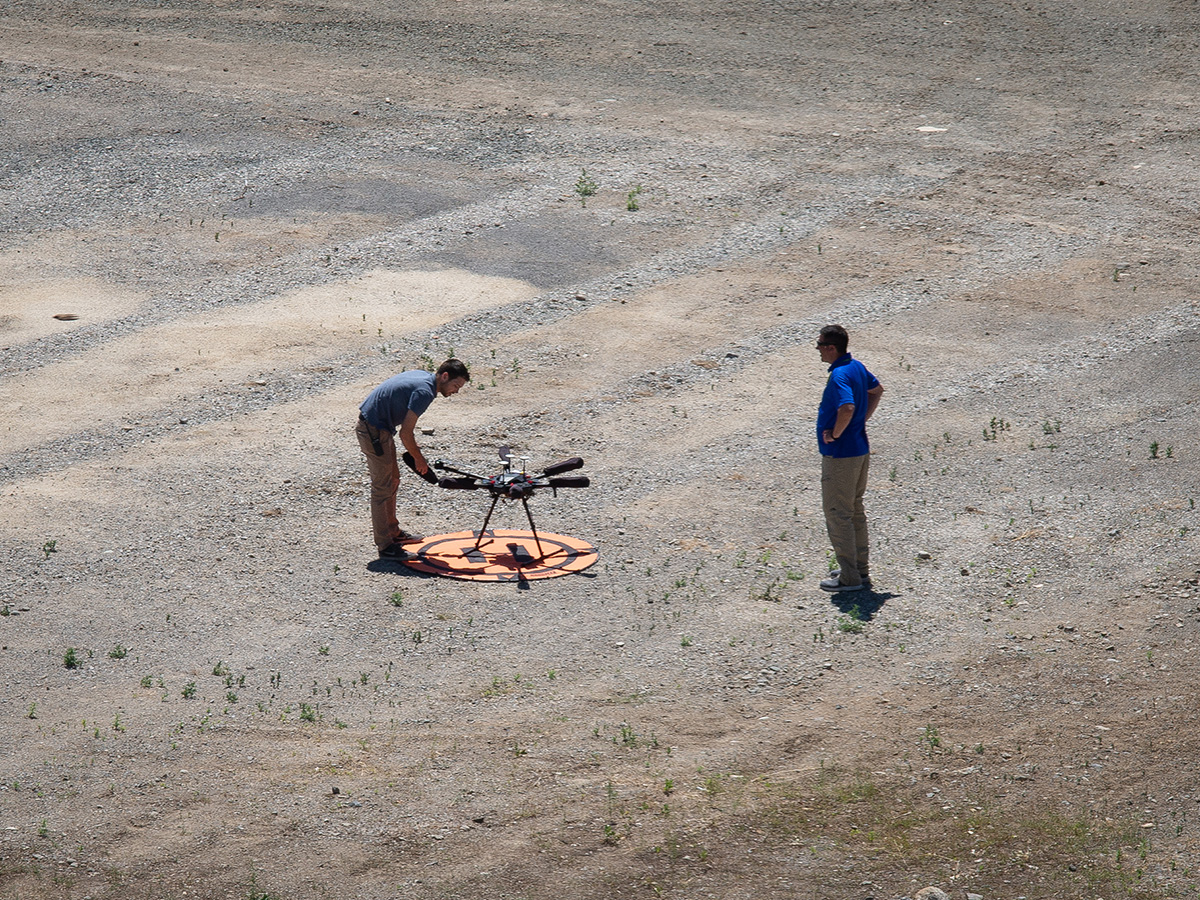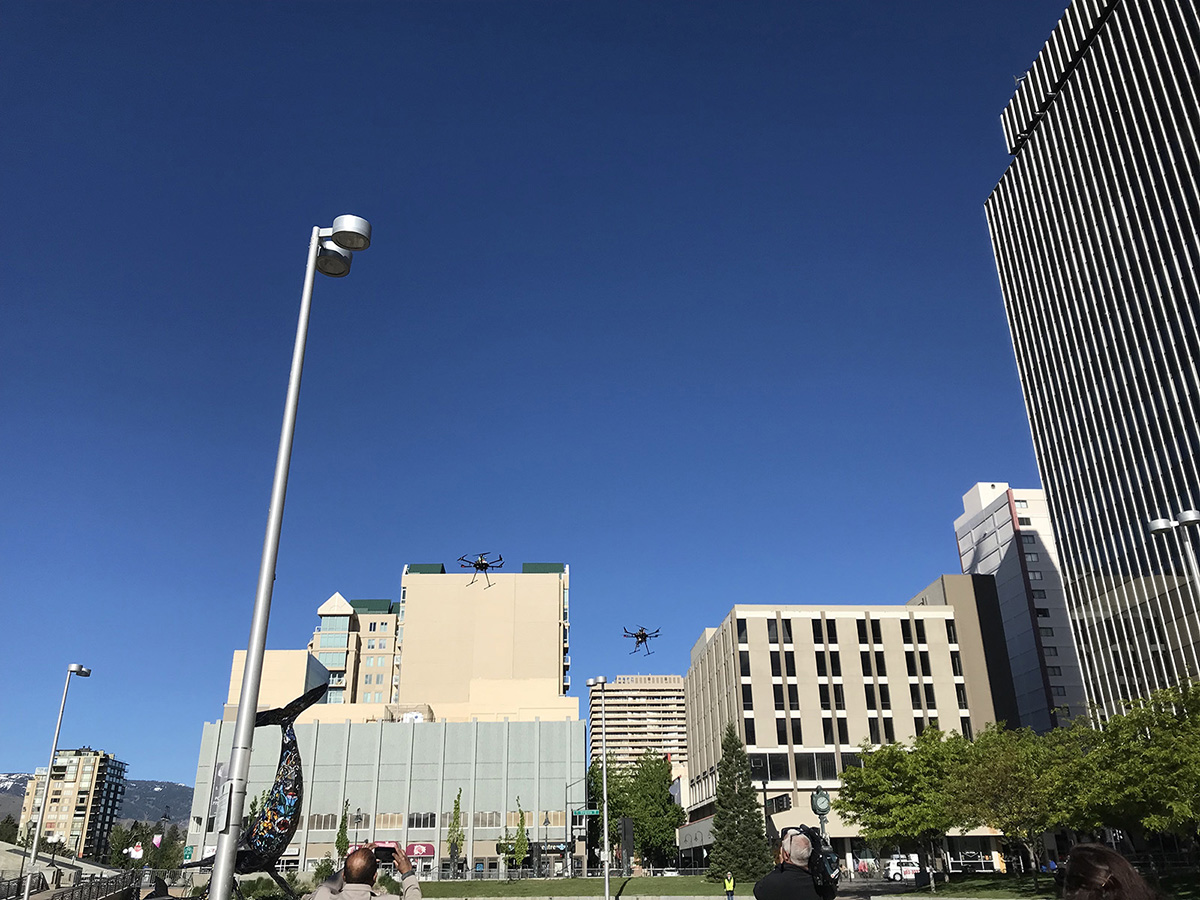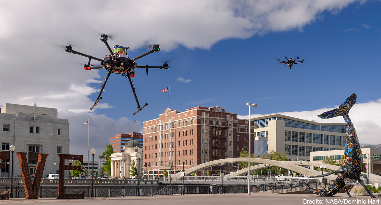 Click to see an image of the Airspace Operations Lab's UTM project team and laboratory Click to see an image of UTM team members in front of the UTM simulation displays Click to see an image of the UTM team preparing for the TCL4/UTM flight tests in Reno, Nevada Click to see an image of test drones getting launched during the 2019 TCL4/UTM test flights in Reno, Nevada